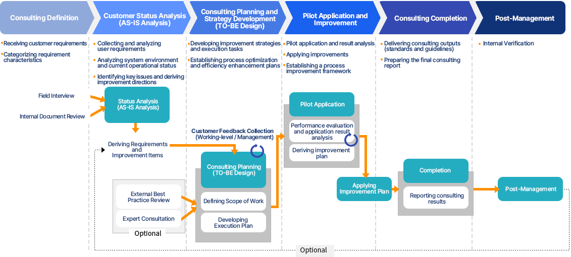 We provide solutions optimized for your organizational environment, from analyzing customer requirements to internalizing improvement actions.
